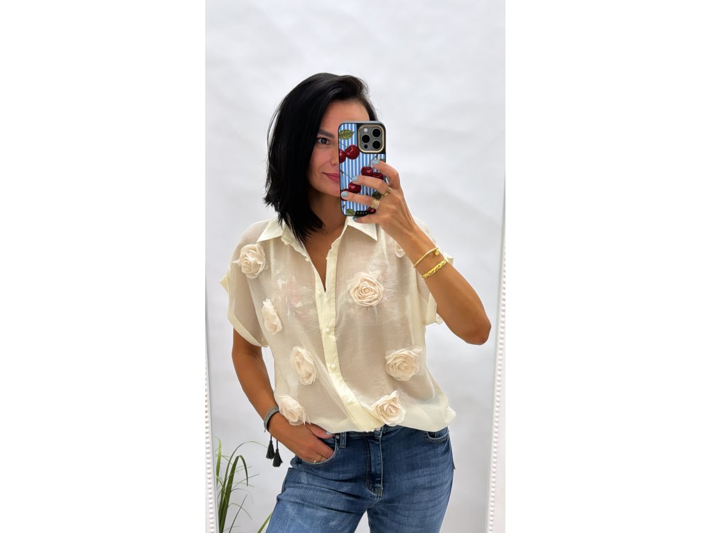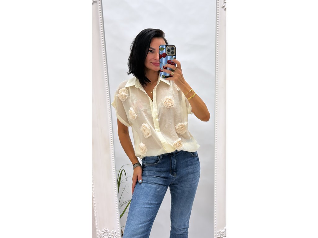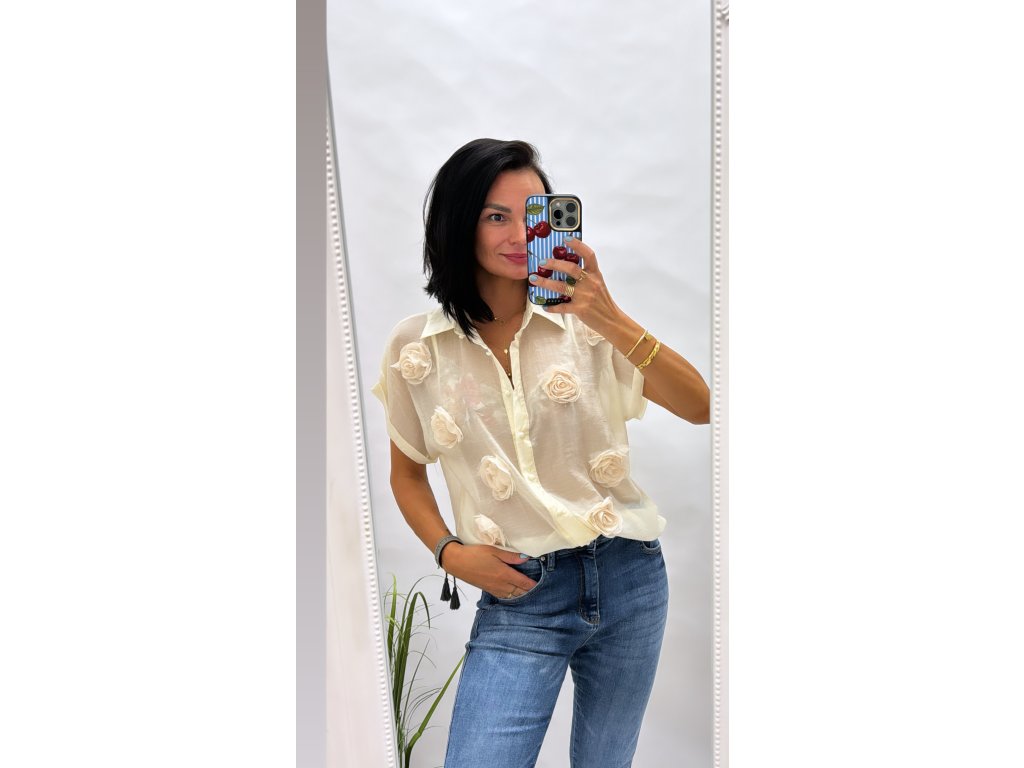 Tato elegantní halenka je perfektní volbou pro každodenní i speciální příležitosti. Vyrobena z lehkého, průsvitného materiálu, zdobena jemnými květinovými aplikacemi, které dodávají šarm a ženskost.