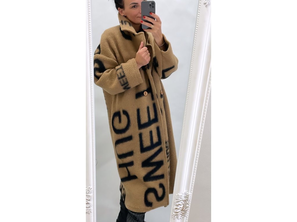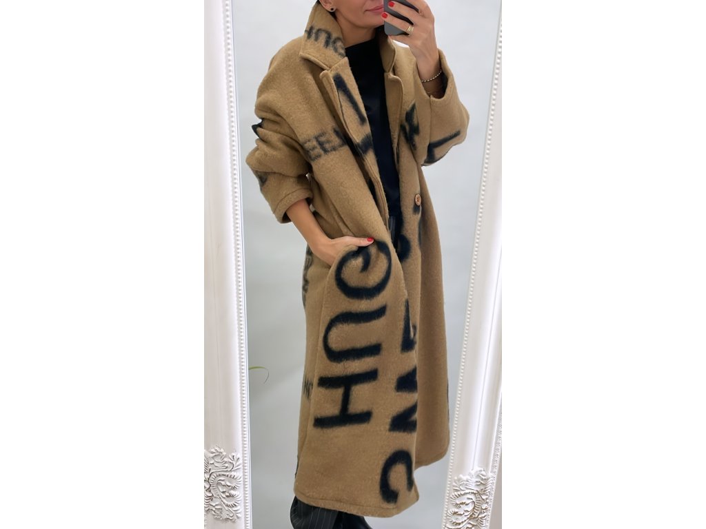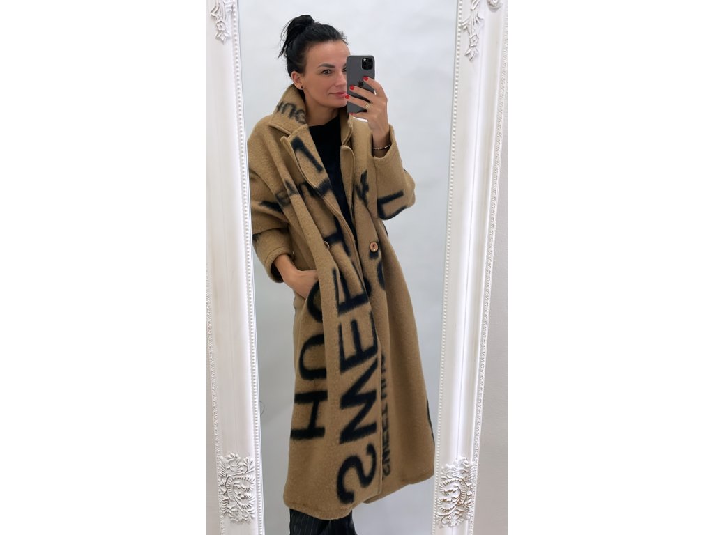 Flaušový kabát bez podšívky, světle hnědé barvy s výraznými nápisy
