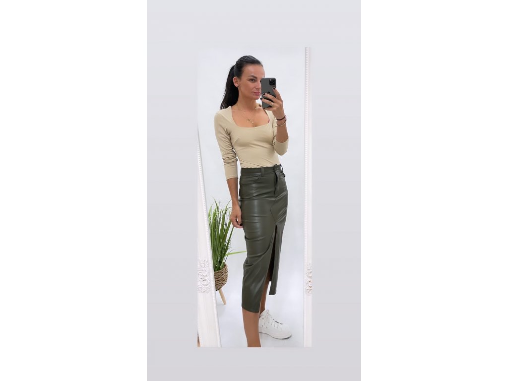 Podívejte se na naši koženkovou sukni v khaki barvě, která dodá vašemu šatníku šmrnc.