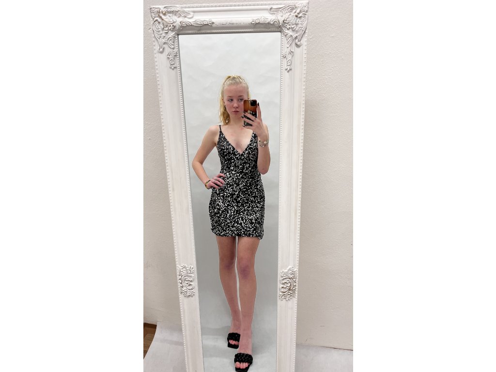 Tyto krátké černé šaty zdobené střibrnými flitry jsou dokonalou volbou pro večerní party. Jejich jemné a oslnivé detaily dodávají šatičkám jedinečný lesk a šmrnc. Buďte připraveni zazářit na každé společenské události v těchto nádherných šatech.