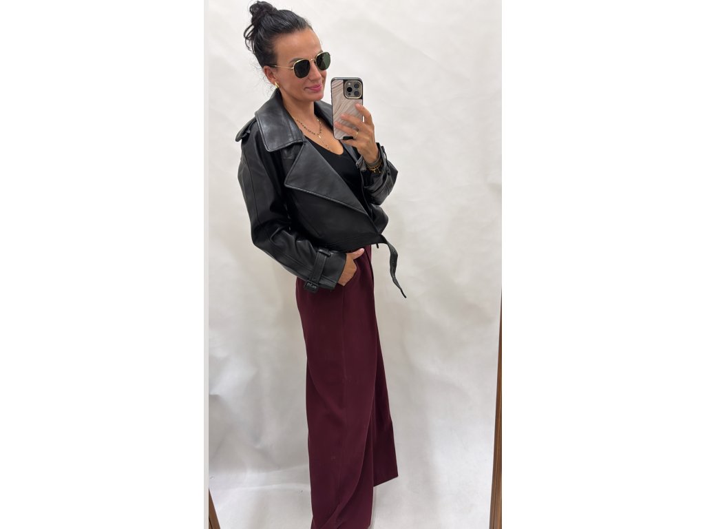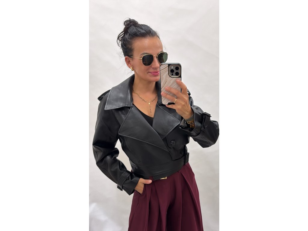 Stylová černá koženková bunda v moderním kratším střihu. Široké klopy, výrazné detaily na ramenou a rukávech, zapínání na knoflíky a pásek v pase pro dokonalé přizpůsobení. Skvěle se hodí k šatům, sukním i džínům a dodá outfitu šmrnc.