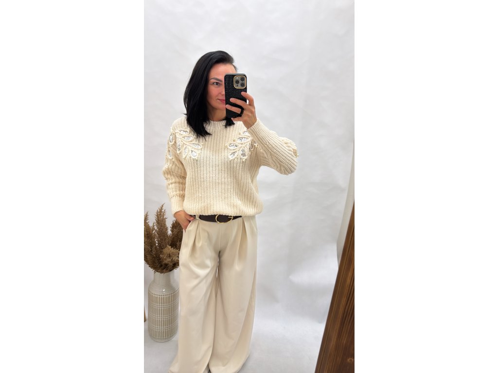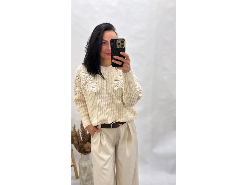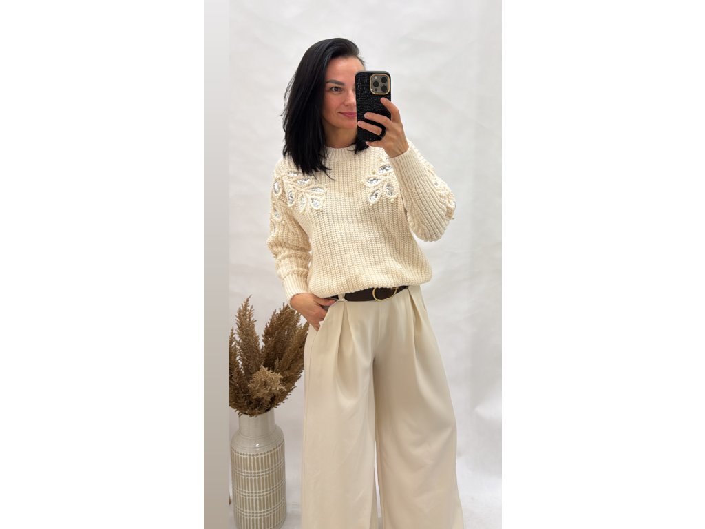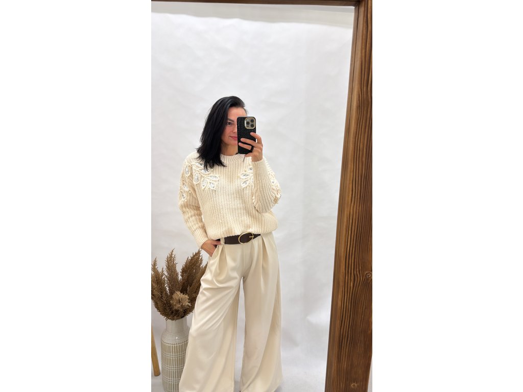 Krásně pletený svetr v jemném krémovém odstínu, ozvláštněný unikátními aplikacemi v podobě vyšívaných listů, perliček a třpytivých detailů. Jeho volný střih zaručuje pohodlí a univerzální velikost skvěle padne na různé typy postav (XS-L). Ideální pro chladnější dny, kdy chcete vypadat stylově, a přitom se cítit příjemně.