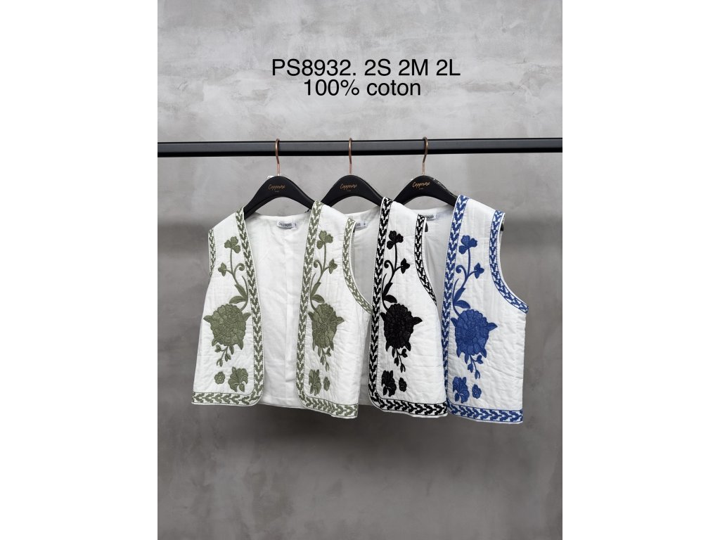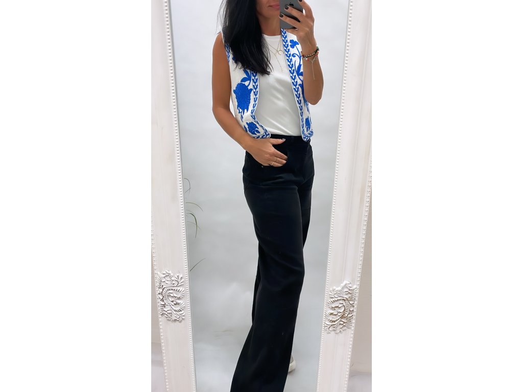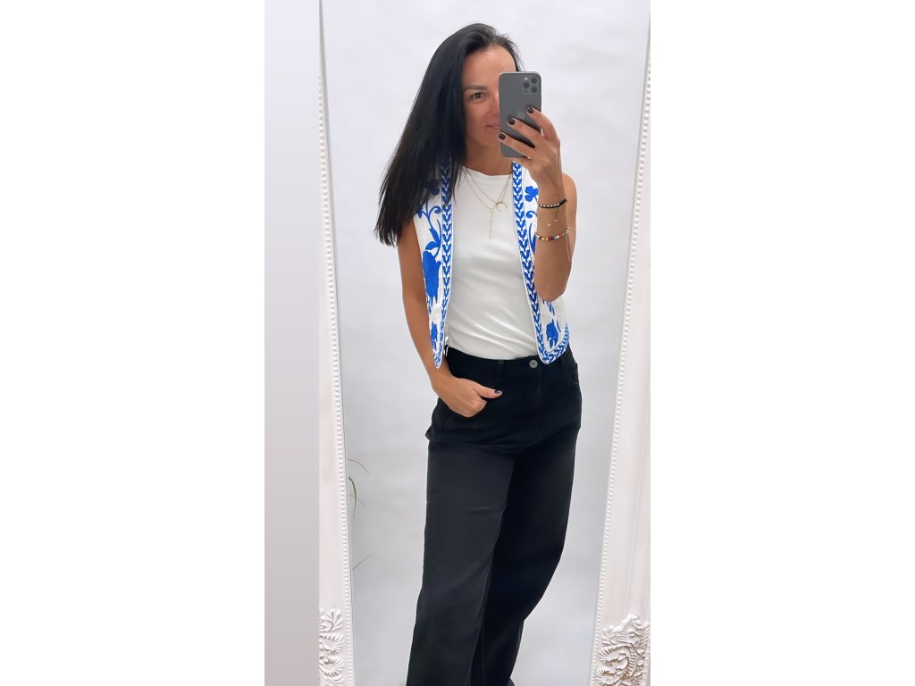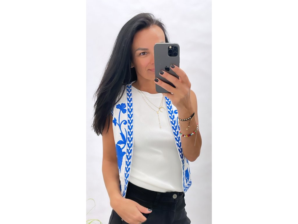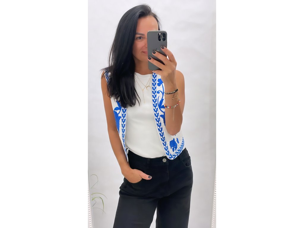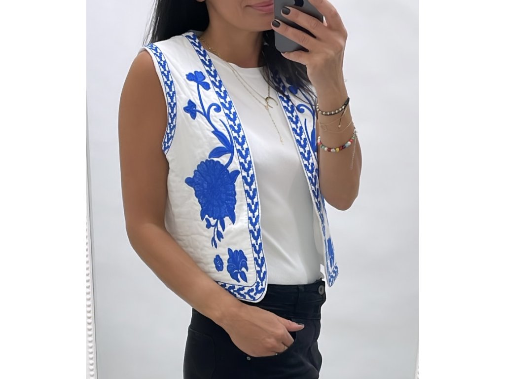 krásná bílá vesta s modrým vyšíváním